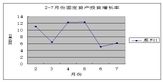 4-5月份增长较快,分别是12.30%和12.36%,而6-7月份有所回落,增幅为7.3%和6.2%。我市投资增长率波动较大,近六个月来投资增长率变化如图: