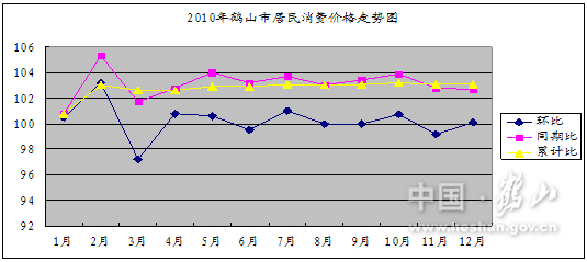 2010年,居民消费价格总走势呈平稳上升态势。从累计比指数看,1-12月居民消费价格累计比总指数为103.1,成功控制全年上升3%左右的目标。累计比自2月份出现较大增幅之后在各个月份平稳上升。从同月比指数看,全年各月同比指数平均升幅达3.1%,超过7个月同比升幅超过3%,2、5、10月同比指数升幅最大,分别达5.1%、4%和3.9%。从环比指数来看,除1-4月环比指数升降幅度较大之外,随后几月升降幅度均较平和,总体物价呈比较稳定的上升趋势。(见下图)