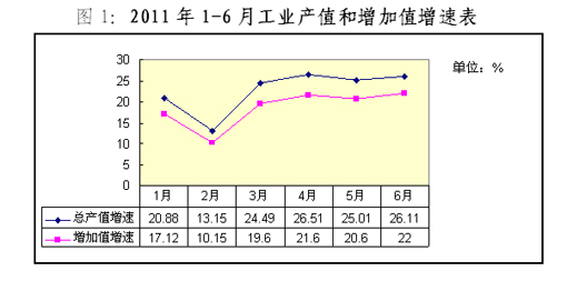 1、生产总值增长稳定 1—6月累计工业总产值214.59亿元,同比增长26.11%;工业增加值48.73亿元,同比增长22%。1—6月工业总产值月均增长保持20%以上,呈现稳定良好势头。(附图1)