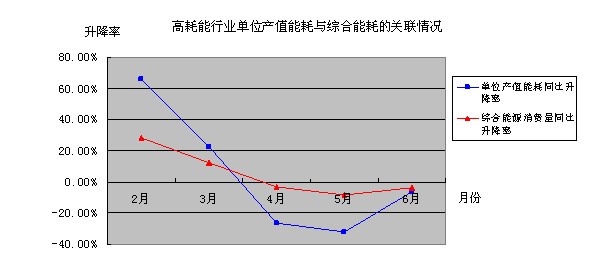 今年上半年,全市有高耗能企业54家,虽然工业总产值仅占全部规模工业总产值2%,但能耗占全部规模工业企业能耗的24.09%。纵观上半年情况显示(详见下图):高耗能行业单位产值能耗上升(或下降),规模工业综合能源消费量同步上升(或下降),两者成正比例关系。这充分显示高耗能企业的用能情况对全市节能降耗工作起着举足轻重的作用。