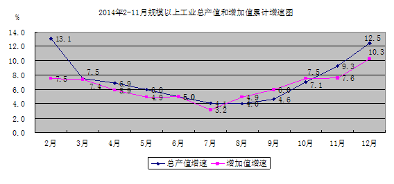 2014年皇家国际官网 规模以上工业产值、增加值增速一直处于低位增长的态势,呈现“开局平稳-逐步下行-稍有回升”的态势,增长速度在7月份探底,下半年逐步小幅度回升。全年实现规模以上工业总产值473.00亿元,增长12.5%;规模以上工业增加值112.05亿元,增长10.3%,增速在江门地区排名第4。(附图1)