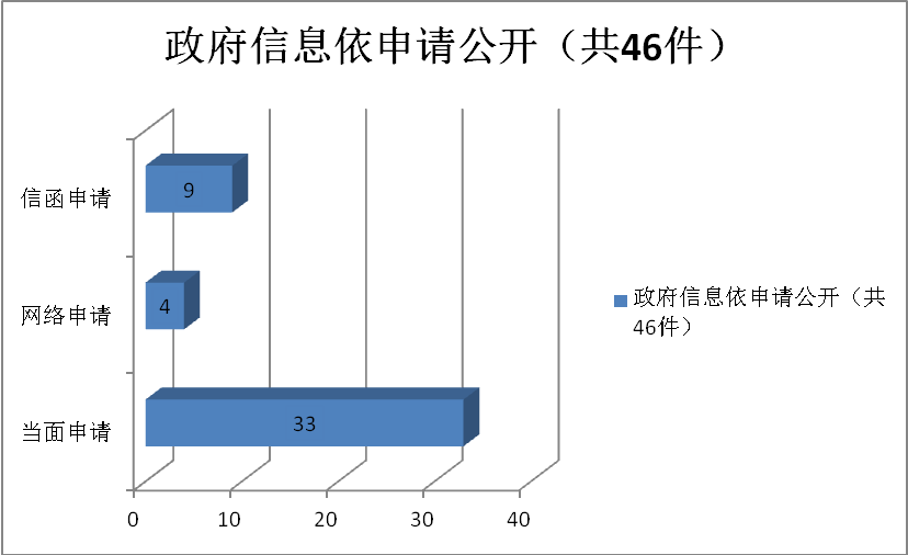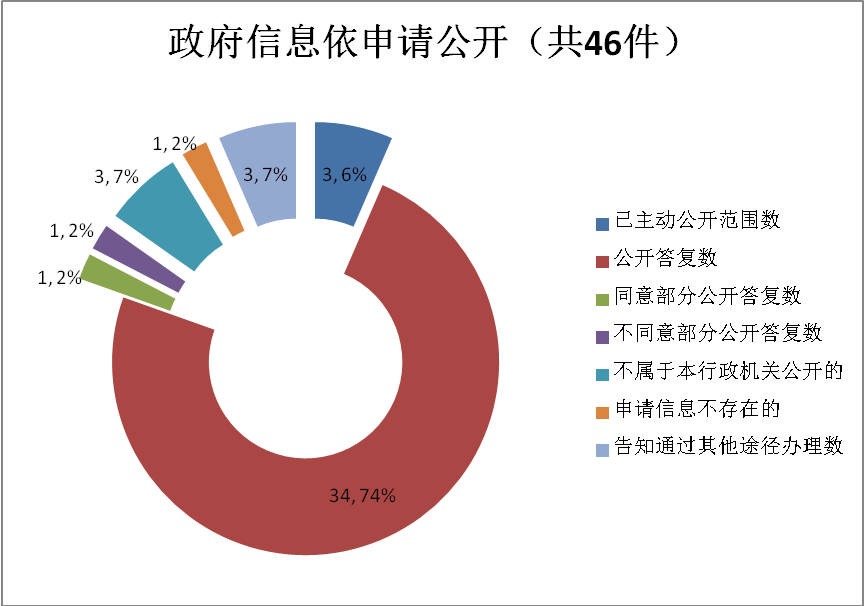 申请受理总数46件中,所有申请均按时办结并按要求答复群众。其中,属于已主动公开范围数3件,占6.5%;同意公开答复数34件,占73.9%;同意部分公开答复数1件,占2.2%;不同意部分公开答复数1件,占2.2%;不属于本行政机关公开的3件,占6.5%;申请信息不存在的1件,占2.2%;告知通过其他途径办理数3件,占6.5%。