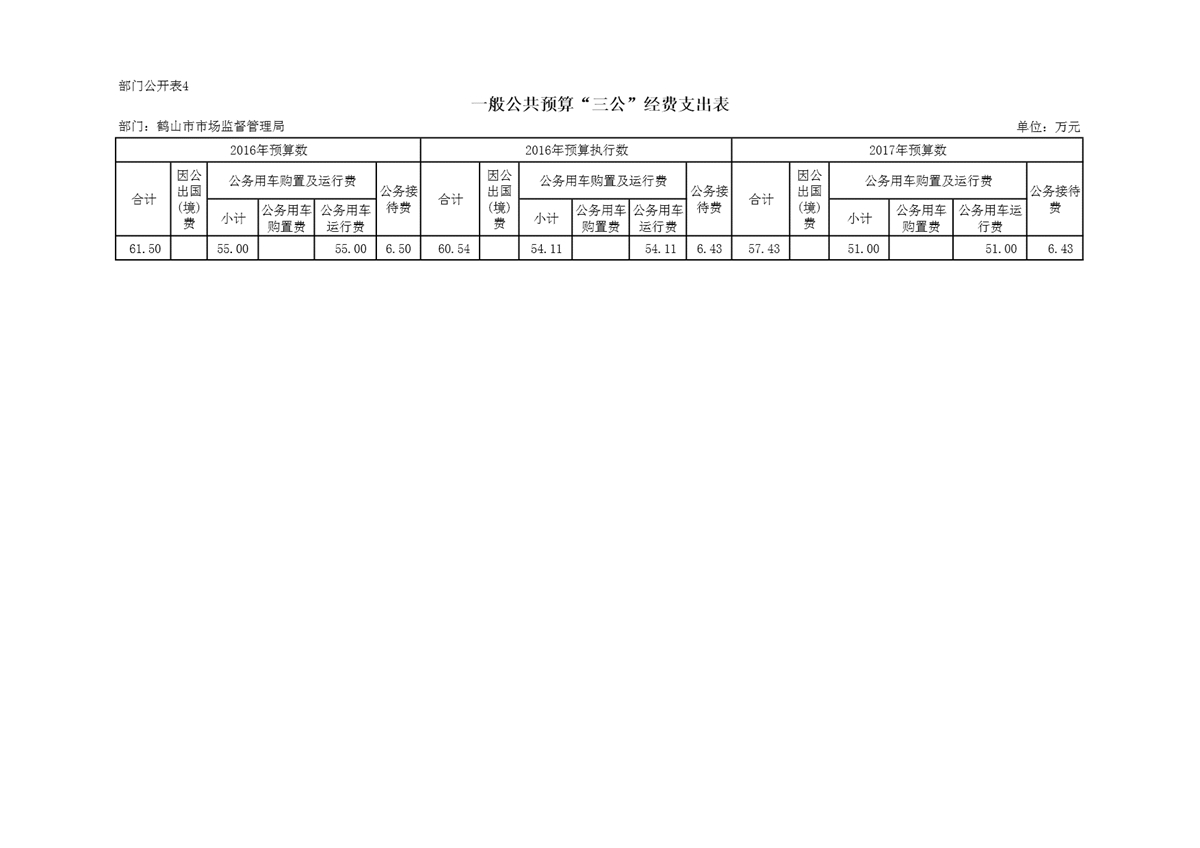 市市场监督管理局 2017年(含下属单位)用一般公共预算财政拨款数开支的出国(境)经费、车辆购置及运行费、公务接待费(简称“三公”经费)支出合计57.43万元。其中:其中:因公出国(境)经费支出0万元;公务用车购置费支出0万元,公务用车运行维护费支出51万元,主要包括公务用车燃油费、年审费、过桥过路费、维修费等车辆支出;公务接待费支出6.43万元,主要包括相关单位来我局进行公务活动接待。