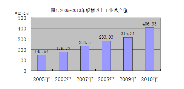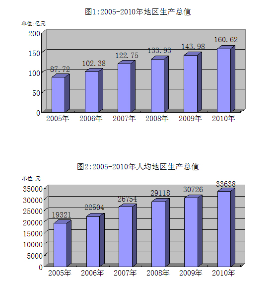 初步核算,2010年全市地区生产总值160.62亿元,增长14.1%。分产业看,第一产业增加值12.64亿元,增长3.6%;第二产业增加值89.86亿元,增长17.5%;第三产业增加值58.12亿元,增长9.9%。三大产业的比例是7.9:55.9:36.2。人均地区生产总值33638元,增长11.7%。全社会用电量为21.85亿千瓦时,增长15.5%,其中城镇居民用电10031万千瓦时,增长6.5%,农村居民用电9537万千瓦时,增长10%。