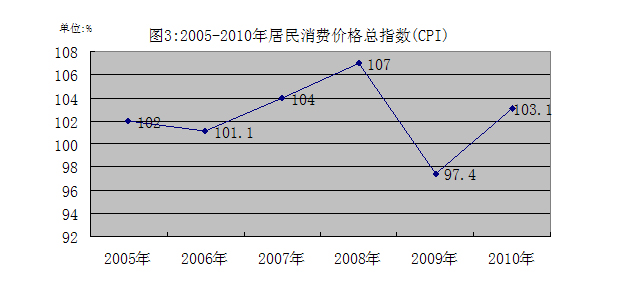 全年居民消费价格总指数为103.1,上涨3.1%。 分类别看,食品类上涨4.6%,烟酒及用品类上涨0.4%,衣着类下降4.2%,家庭设备用品及维修服务类下降0.2%,医疗保健和个人用品类累计上涨3.8%,交通和通信类上涨2.6%, 娱乐教育文化用品及服务类上涨1.8%,居住类上涨5.8%。