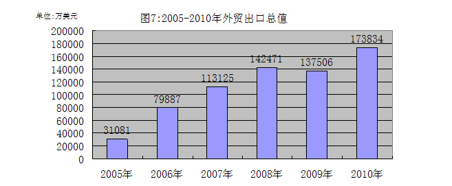 2010年全市外贸出口总值17.38亿美元,增长26.4%。按贸易性质分,一般贸易出口6.10亿美元,增长25.5%;加工贸易出口11.29亿美元,增长26.9%。按企业性质分,民营企业出口3.53亿美元,增长27.2%;三资企业出口13.85亿美元,增长26.2%。主要出口商品中,机电产品出口总值8.11亿美元,增长41.6%;印刷品出口总值3.05亿美元,增长7.4%;纺织品出口总值2.13亿美元,增长12.3%;鞋类出口总值0.82亿美元,增长32.9%。主要出口地区中,北美洲出口总值4.91亿美元,增长20.6%;欧洲出口总值4.38亿美元,增长13.5%;香港出口总值4.18亿美元,增长46.1%。全年外贸进口总值4.81亿美元,增长25%。