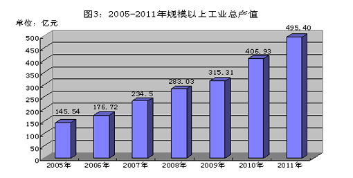 初步核算,2011年全市地区生产总值188.75亿元,增长12.0%。分产业看,第一产业增加值16.23亿元,增长3.8%;第二产业增加值106.99亿元,增长14.5%;第三产业增加值65.53亿元,增长9.9%。三大产业的比例是8.6:56.7:34.7。人均地区生产总值37991元,增长12.9%。全社会用电量为23.97亿千瓦时,增长9.3%,其中城镇居民用电11490万千瓦时,增长14.5%,农村居民用电11092万千瓦时,增长16.3%。