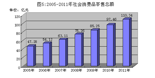 2011年全市实现社会消费品零售总额110.34亿元,增长14.2%。按行业分,贸易批发业零售额9.15亿元,增长15.3%;贸易零售业82.46亿元,增长14.0%,以上两者占全市社会消费品零售总额的83.0%,拉动社会消费品零售总额增长11.7个百分点;住宿业零售额0.62亿元,增长17.9%;餐饮业零售额18.11亿元,增长14.3%。按所在地分,城市消费品市场零售额63.15亿元,增长15.0%;农村消费品市场零售额47.19亿元,增长13.1%,两者分别拉动社会消费品零售总额增长8.5和5.7个百分点。