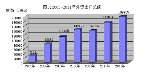 2011年全市外贸出口总值19.97亿美元,增长14.9%。按贸易性质分,一般贸易出口7.42亿美元,增长21.7%;加工贸易出口12.55亿美元,增长11.2%。按企业性质分,民营企业出口4.79亿美元,增长35.5%;三资企业出口15.18亿美元,增长9.6%。主要出口商品中,机电产品出口总值9.25亿美元,增长9.8%;印刷品出口总值3.47亿美元,增长13.7%;纺织品出口总值2.61亿美元,增长22.2%;鞋类出口总值0.83亿美元,增长1.8%。主要出口地区中,美国出口总值4.72亿美元,增长4.4%;欧盟出口总值4.28亿美元,增长6.7%;香港出口总值5.21亿美元,增长24.7%。全年外贸进口总值4.62亿美元,下降3.9%。