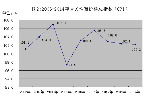 全年居民消费价格总指数为102.2,上涨2.2%。 分类别看,食品类价格上涨4.3%,烟酒类价格上涨0.9%,衣着类上涨1.0%,家庭设备用品及维修服务类上涨0.7%,医疗保健和个人用品上涨2.5%,交通及通信下降1.2%,娱乐教育文化用品及服务上涨2.4%,居住类上涨0.2%。