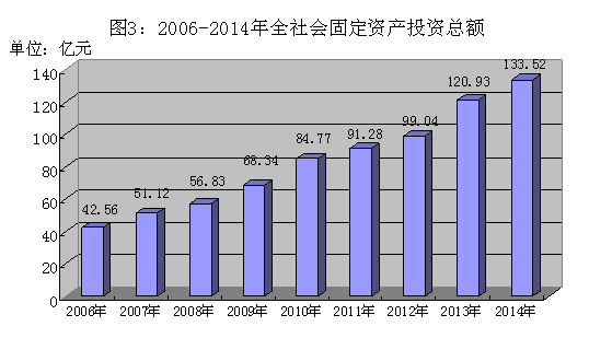 2014年固定资产投资133.52亿元,增长15.0%。按投资结构分,基础设施投资27.00亿元,下降41.6%;房地产投资50.59亿元,增长60.1%;其他投资55.93亿元,增长46.1%;。按产业分,第一产业投资1.36亿元;第二产业投资49.23亿元,下降28.0%,其中制造业投资42.72亿元,增长34.3%;第三产业投资82.94亿元,同比增长75.5%。