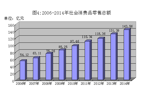 2014年全市实现社会消费品零售总额143.56亿元,增长9.3%。按行业分,贸易批发业零售额11.80亿元,增长8.9%;贸易零售业108.42亿元,增长9.4%,以上两者占全市社会消费品零售总额的83.7%;住宿业零售额0.61亿元,下降2.2%;餐饮业零售额22.73亿元,增长8.9%。按所在地分,城市消费品市场零售额87.67亿元,增长9.8%;农村消费品市场零售额55.89亿元,增长8.4%。
