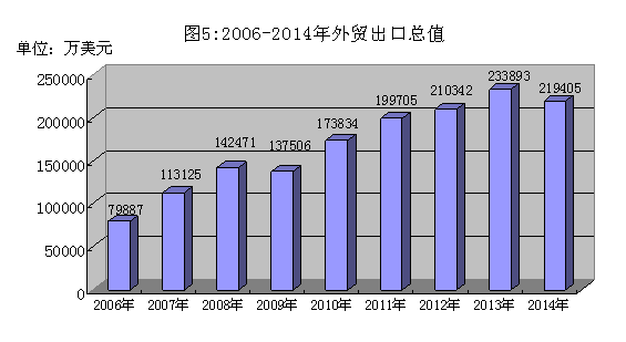 2014年全市外贸出口总值21.94亿美元,下降6.2%。按贸易性质分,一般贸易出口9.92亿美元,下降9.0%;加工贸易出口12.02亿美元,下降3.7%。按企业性质分,民营企业出口6.70亿美元,下降5.7%;三资企业出口15.24亿美元,下降6.4%。主要出口商品中,机电产品出口总值9.62亿美元,下降12.2%;印刷品出口总值3.77亿美元,增长7.4%;纺织品出口总值2.86亿美元,下降14.9%;鞋类出口总值0.61亿美元,下降36.3%。主要出口地区中,美国出口总值5.36亿美元,下降3.9%;欧盟出口总值5.05亿美元,增长4.0%;香港出口总值4.41亿美元,下降9.9%。全年外贸进口总值4.09亿美元,下降8.7%。