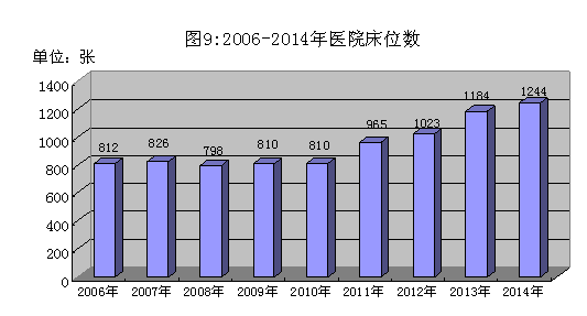 全市有医院、卫生院15间;卫生机构床位1244张,其中等级医院床位1144张;卫生机构人员数2555人,卫生技术人员有1805人,其中:执业医师616人,执业助理医师106人,注册护士768人,药剂人员202人,检验人员113人。全市卫生站127个,卫生站总人数196人。