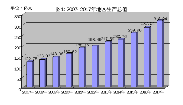 数据显示,2017年全市地区生产总值318.94亿元,增长8.8%。分产业看,第一产业增加值23.01亿元,增长3.7%;第二产业增加值163.62亿元,增长8.2%;第三产业增加值132.30亿元,增长10.5%。三大产业的比例是7.2:51.3:41.5。人均地区生产总值62957元,增长8.2%。全社会用电量为34.67亿千瓦时,增长6.0%,其中城镇居民用电19056万千瓦时,增长4.9%,农村居民用电19062万千瓦时,增长4.0%。
