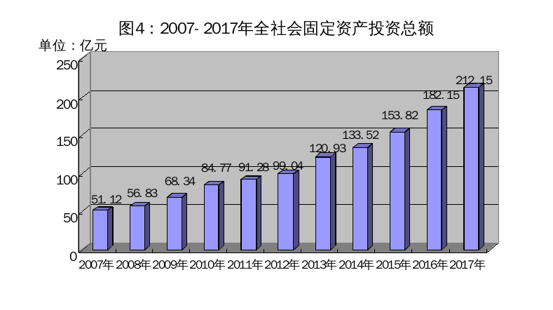 2017年固定资产投资完成212.15亿元,增长16.5%,其中基础设施42亿元,下降7.1%;房地产开发51.18亿元,增长32.7%;其他投资118.97亿元,增长20.9%。按产业分,第一产业投资1.46亿元;第二产业完成投资116.05亿元,增长29.3%;第三产业完成投资94.64亿元,增长3.3%。