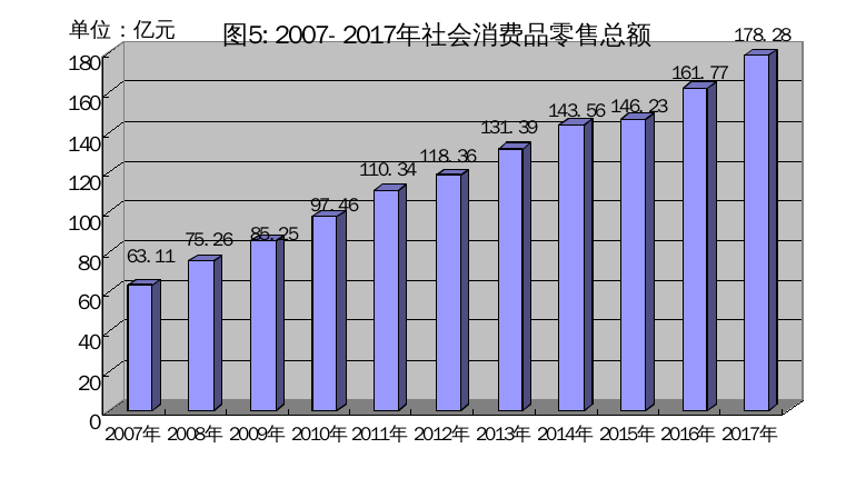 2017年全市实现社会消费品零售总额178.28亿元,增长10.2%。按行业分,贸易批发业零售额17.30亿元,增长14.5%;贸易零售业133.41亿元,增长10.5%,以上两者占全市社会消费品零售总额的84.5%;住宿业零售额0.91亿元,增长21.5%;餐饮业零售额26.61亿元,增长5.5%。
