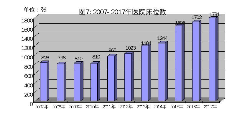 全市有医院、卫生院15间;卫生机构床位1781张,卫生机构人员数3192人,卫生技术人员有2842人,其中:执业医师548人,执业助理医师190人,注册护士1129人,药剂人员229人,检验人员103人。全市卫生站140个,卫生站总人数190人。
