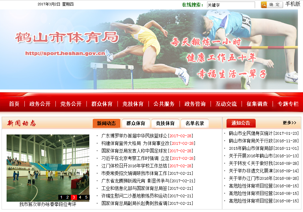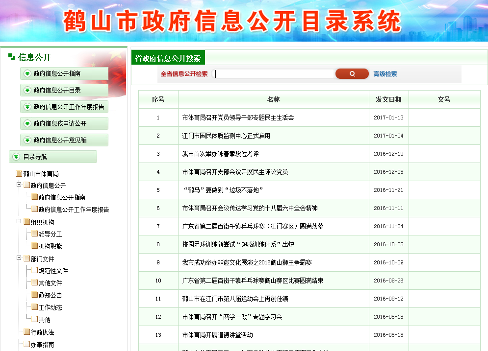 体育局网(// www.sports.hjgjgw.com),局网站设立13大栏目。公开的内容包括新闻动态、通知公告、政务公开、党务公开、群众体育、竞技体育、政策法规、公共服务、政务咨询、互动交流、征集意见、专题专栏、名单名录等有关情况。