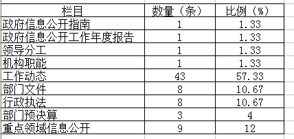 (一)在我局部门网站主动公开政府信息情况。2018年1月至12月,我局部门网站发布信息75条,其中政府信息公开指南1条,占1.33%,政府信息公开工作年度报告1条,占1.33%,领导分工1条,占1.33%,机构职能1条,占1.33%,工作动态43条,占57.33%,部门文件8条,占10.67%,行政执法8条,占10.67%,部门预决算3条,占4%,重点领域信息公开类9条,占12%。
