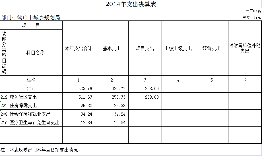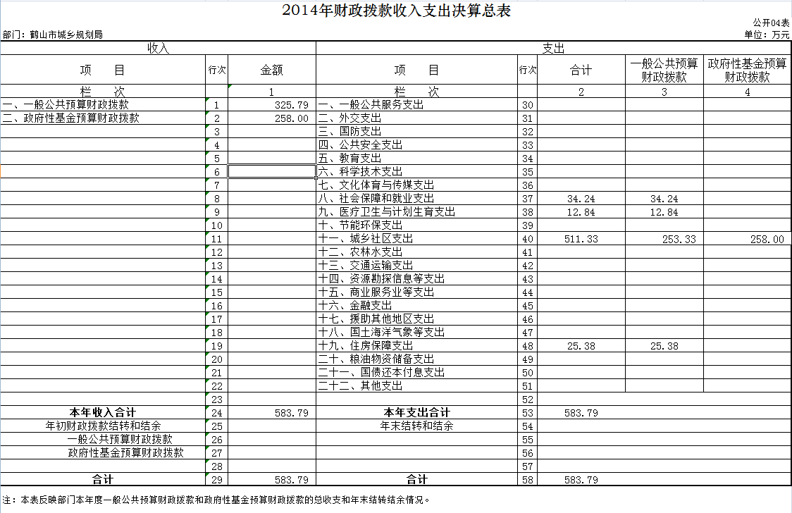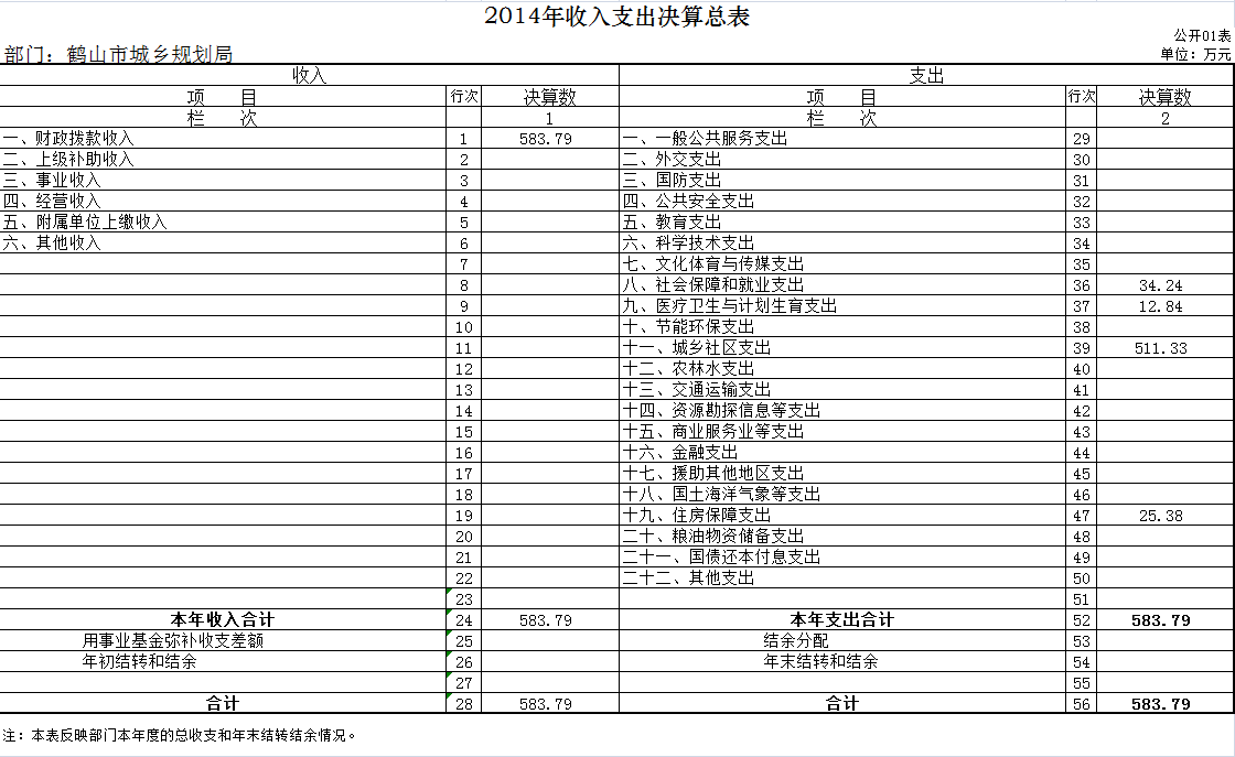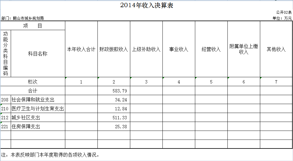 2014 年部门财政拨款收入决算583.79万元。其中:一般公共预算财政拨款收入325.79万元,占55.8%;政府性基金预算财政拨款收入258万元占44.19%