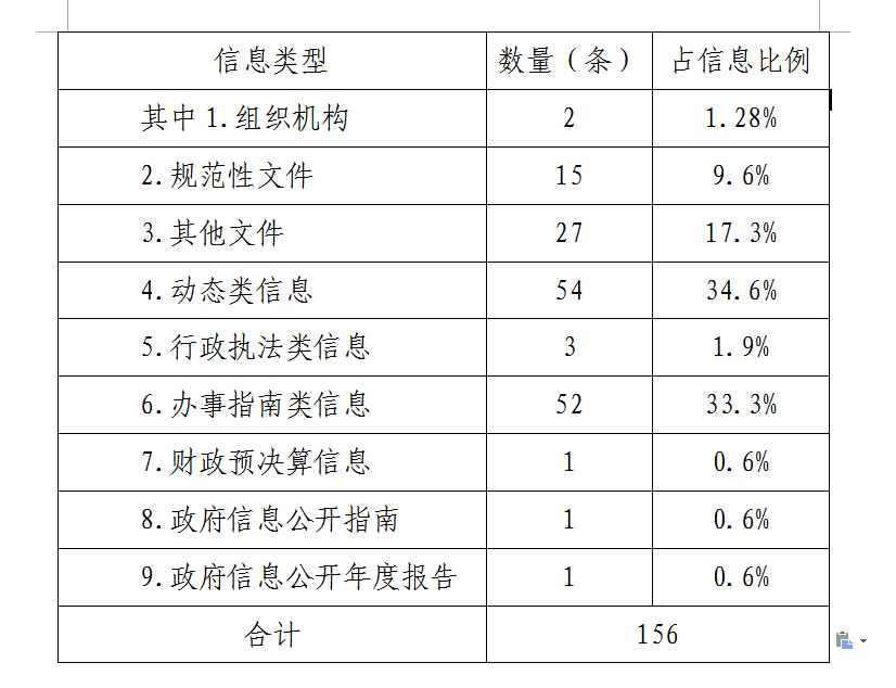 我镇人民政府2015年全年通过信息公开网站主动公开政府信息156条,其中1.组织机构2条;2.规范性文件15条;3.其他文件27条;4.动态类信息54条;5.行政执法类信息3条;6.办事指南类信息52条;7.财政预决算信息1条;8.政府信息公开指南1条;9.政府信息公开年度报告1条。