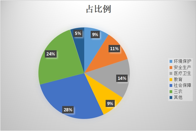 在政务公开栏主动公开政府信息中,“三农”和社会保障占的比例较大,分别占了24%和28%,另外环境保护占9%、安全生产11%、教育占9%、医疗卫生占14%,其他占5%。
