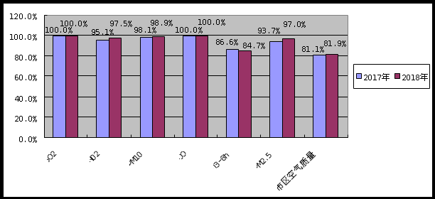 2018年皇家国际官网 大气自动监测站点空气质量优良天数比例为81.9%,同比上升0.8个百分点。二氧化硫、二氧化氮、PM10、一氧化碳和PM2.5年均浓度值同比均有所改善,其中二氧化硫降幅最大,同比下降33.3%,其次是一氧化碳、PM2.5、二氧化氮和PM10,同比下降12.5%、10.8%、7.7%、3.4%;臭氧日最大8小时平均浓度值同比有所升高,同比上升7.0%;其中臭氧日最大8小时平均浓度为184微克/立方米,超出《环境空气质量标准》(GB3095-2012)二级标准要求,其余五项污染物年平均浓度均达到《环境空气质量标准》(GB3095-2012)二级标准要求。
