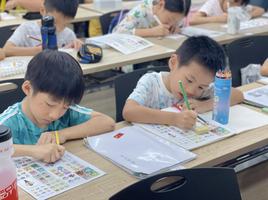2024年7月10日,孩子们在祥盛社区暑托班上绘画。