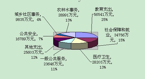 2014年拟安排地方公共财政预算支出224,364万元,比上年实绩217,056万元增加7,308万元,增长3.37%,上解预算支出18,869万元,年终结余3,561万元。地方公共财政预算支出的主要项目为:教育支出56,541万元,占地方公共财政支出的25.20%;社会保障和就业支出34,756万元,占地方公共财政支出的15.49%;医疗卫生28,203万元,占地方公共财政支出的12.57%;农林水事务支出28,991万元,占地方公共财政支出的12.92%;城乡社区事务9,835万元,占地方公共财政支出的4.38%;住房保障支出3,466万元,占地方公共财政支出的1.54%(详见附件二)。