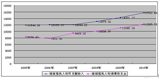 经济保持健康发展,经济效益进一步提升。在促进经济又好又快发展的同时,不断加大就业再就业工作力度,努力提高在职人员、退休人员的收入水平和低收入群体的低保标准,2010年城镇居民人均可支配收入达到15763.48元,比2005年增长了32%,年均增长5.7%。随着收入的增加,居民的消费水平逐步升级,消费领域进一步拓宽。2010年人均消费性支出12265.76元,比2005年增长了47.9%,年均增长8.1%。(附图1)